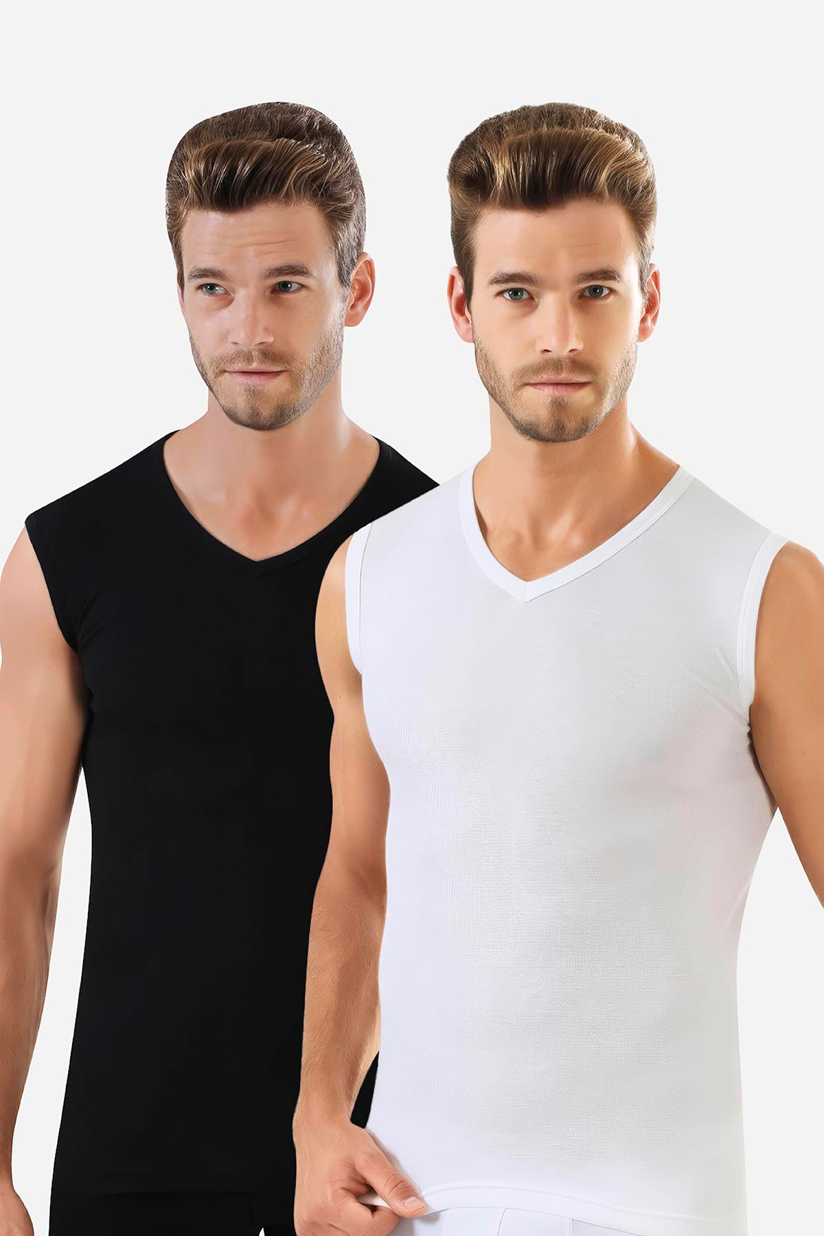 Erkek Siyah - Beyaz Tişört Sıfır Kol V Yaka Kolsuz Atlet 2'li Paket %100 Pamuklu (1115-2)