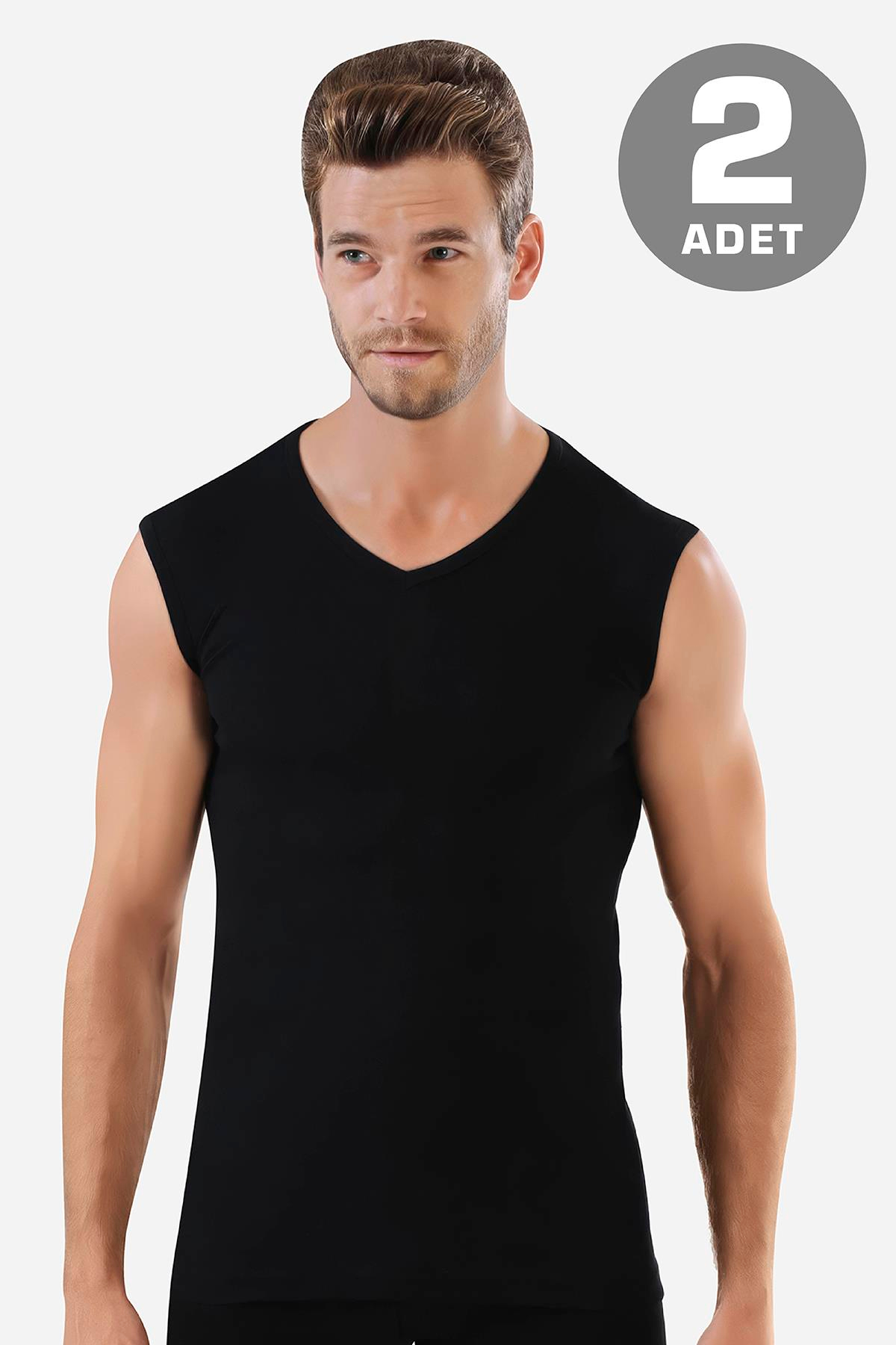 Erkek Siyah Pamuklu Tişört Sıfır Kol V Yaka Kolsuz Atlet 2'li Paket